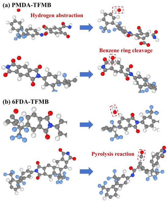 Figure 8 illustrates the primary pathways for OH and CO formation under atomic oxygen (AO) erosion in PMDA-TFMB and 6FDA-TFMB. The high abundance of hydrogen atoms within the polymer system facilitates hydrogen abstraction reactions with AO. In fluorinated polyimides, the -CF3 groups significantly withdraw electron density [37], altering the electronic distribution around the benzene rings and polarizing the carbon-hydrogen bonds. This polarization increases the partial positive charge on the hydrogen atoms, making them more susceptible to reacting with AO to form hydroxyl radicals. As erosion progresses, AO reacts with carbon atoms in the polyimide structure, leading to the cleavage of benzene and imide rings and resulting in the production of small molecules such as CO. Additionally, AO continuously transfers its kinetic energy into the system as heat, increasing the polymer temperature and inducing pyrolysis of the polyimides [38]. The combined effects of AO impact and thermal decomposition accelerate CO formation.