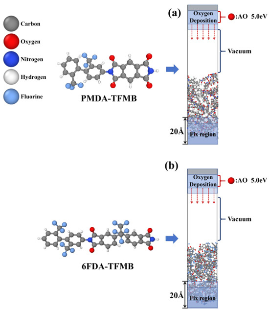 Figure 9 presents the molecular configurations and equilibrium crystal structures of PMDA-TFMB and 6FDA-TFMB used in this study. Each of the 36 PMDA-TFMB and 25 6FDA-TFMB polyimide chains were placed into a periodic unit cell of 20 Å × 20 Å × 60 Å, followed by a 500 ps relaxation in the NPT ensemble at 298 K and 1 atm. The cell densities stabilized at equilibrium values (ρPMDA-TFMB = 1.47 g/cm3, ρ6FDA-TFMB = 1.46 g/cm3), closely matching the standard densities (1.49 g/cm3 for PMDA-TFMB and 1.48 g/cm3 for 6FDA-TFMB). After relaxation, the cell sizes were 23.17 Å × 23.17 Å × 38.97 Å for PMDA-TFMB and 22.99 Å × 22.99 Å × 39.18 Å for 6FDA-TFMB. The periodic boundary in the Z direction was removed and extended to 120 Å, followed by an NVT ensemble relaxation at 300 K for 500 ps. To prevent model displacement during AO impact, the bottom 20 Å of atoms were fixed as a substrate buffer layer.
