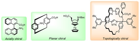 Recently, the preparation and application of compounds (including amino acid derivatives) possessing unusual types of chirality have attracted more and more attention (Figure 1). Synthetic approaches to racemic and enantiomerically pure derivatives and analogs of amino acids possessing axial (biphenyl and binaphthyl derivatives [17,18,19,20,21,22,23,24,25,26]), planar (ferrocene derivatives [27,28,29,30], [2.2]paracyclophane [31,32,33,34,35,36] and macrocyclic cyclophanes [37,38,39]), and helical chirality [40,41,42,43,44] have been proposed. Amino acid derivatives containing adamantane [45,46,47], calix[4]arene [48,49], and fullerene [50,51,52] residues as a chirality element, as well as catenane and rotaxane motifs possessing topological chirality [53,54,55], have been synthesized. It has been shown that the introduction of amino acid fragments allows obtaining stable conformational isomers of pillar[5]arenes [56,57,58,59]. Axial and planar-chiral derivatives of amino acids find application in chiral organocatalysis [19,20,21,23,34,60,61,62,63] and the design of peptides with original structures [28,64].