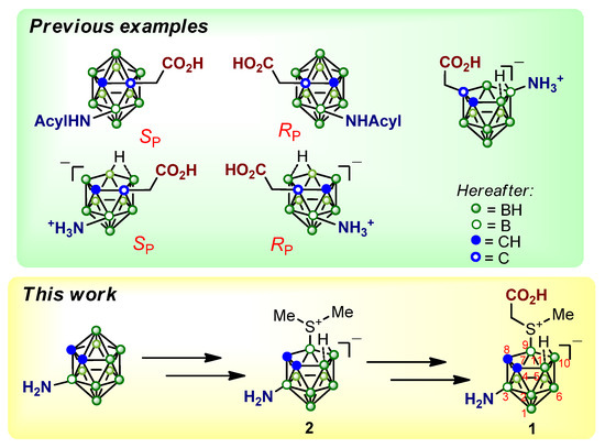Recently, we have synthesized a series of carborane-containing derivatives of natural amino acids in which the nido-carborane residue carries a negative charge, and the positive charge is localized on the nitrogen or sulfur atoms [82,83,84]. In these sulfur-containing α-amino acids, a nido-carborane residue is located in the side chain [83,84]. A number of primary amines and carboxylic acids were obtained earlier on the basis of 9-methylthio-nido-carborane [85]. In the present work, we synthesized for the first time a planar-chiral nido-carborane-based amino acid 1 (Figure 2), in which the amino group is attached to the B(3) atom, and the carboxyl group is linked to the B(9) position via the sulfur atom carrying a positive charge. Using the example of dimethylsulfonio derivative 2, the precursor of amino acid 1, we have, for the first time, carried out a detailed NMR spectroscopy study of the structure of a nido-carborane derivative containing amino and dialkysulfonio substituents at positions 3 and 9.