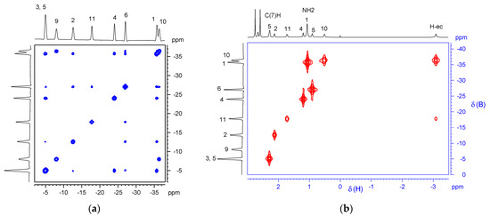 2D NMR spectra of compound 2: (a) 11B–11B COSY spectrum (160 MHz, CDCl3); (b) 2D 1H{11B}–11B{1H} HMQC spectrum (500 MHz, CDCl3).