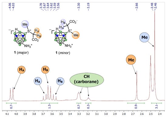 Accordingly, in the 1H NMR spectra, the methylene protons of the predominant diastereomers of compounds 1 and 7 are down-field shifted as compared to the resonances corresponding to the minor diastereomers; the peaks of the methyl group protons of the predominant diastereomers are up-field shifted (Figure 4). This is due to the presence of an induced diatropic ring current in the nido-carborane cage, which causes an up-field shift of the endocyclic proton and apical boron-1 [106].