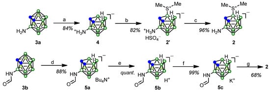 Synthesis of 3-amino-9-dimethylsulfonio-nido-carborane (2). (a) piperidine, benzene, rt, 48 h [86]; (b) DMSO, H2SO4, H2O, 80 °C, 4.5 h; (c) NaHCO3, H2O, rt, 0.5 h; (d) TBAF, THF/H2O, rt, 9 days; (e) Amberlite IR-120 (H form), EtOH, rt, 1 h; (f) 1. KOH, EtOH, 0.5 h; 2. CO2 solid (excess), rt, 0.5 h; (g) 1. DMSO, H2SO4, H2O, 80 °C, 4.5 h; 2. KOH, rt, 1 h.