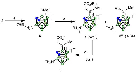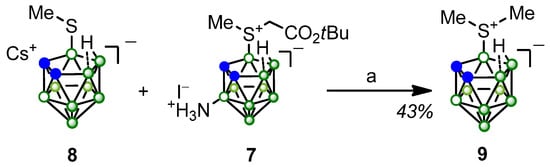 - Zakharova, M.V.; Sivaev, I.B.; Anufriev, S.A.; Timofeev, S.V.; Suponitsky, K.Y.; Godovikov, I.A.; Bregadze, V.I. A new approach to the synthesis of functional derivatives of nido-carborane: Alkylation of [9-MeS-nido-7,8-C2B9H11]−. Dalton Trans. 2014, 43, 5044–5053. [Google Scholar] [CrossRef]