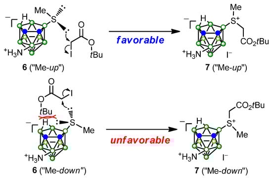 The ratio of the integral intensities of the proton signals of the diastereomers of compounds 1 and 7 in the 1H NMR spectra was 7:3 and 6:4, respectively, which is consistent with the previously observed formation of diastereomers of 9-dialkylsulfonio nido-carboranes in nonequivalent amounts [84,101,105]. Apparently, this phenomenon is due to the fact that the lone pair of electrons of the sulfur atom in thioether 6 is more accessible for interaction with the alkylating agent in the case when the methyl group is turned “upwards” with respect to the “open pentagonal face” of nido-carborane, and lone pair of electrons of sulfur atom is not shielded by a high electronic density near the open face of nido-carborane (Scheme 4). This results in the preferential formation of isomer 7, in which the tert-butoxycarbonylmethyl substituent occupies a “down-directed position” relative to the “open face” of the carborane, and the methyl substituent is in an “up-directed position”. The formation of diastereomers of compound 7 in nonequivalent amounts may also be due to the fact that one of them is more thermodynamically stable than the other.