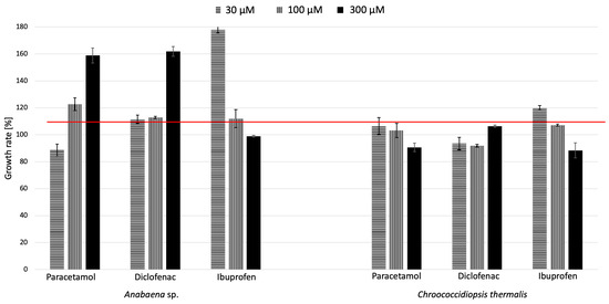 To study the effects of specific pharmaceuticals, two freshwater cyanobacteria species, Anabaena sp. and Chroococcidiopsis thermalis, were cultivated for 3 weeks in the presence of paracetamol, diclofenac, and ibuprofen at three different concentration levels (30 µM, 100 µM, and 300 µM). The three concentrations of pharmaceuticals tested in this study were chosen to cover a range of both environmentally relevant and experimental levels. The 30 µM concentration approximates the higher end of pharmaceutical concentrations reported in surface waters, particularly in areas with significant contamination. The intermediate concentration of 100 µM was included to observe cyanobacterial responses under moderate exposure conditions, while the 300 µM concentration, though exceeding typical environmental levels, allowed for the investigation of the cyanobacteria’s capacity to handle extreme contamination scenarios. This range of concentrations provides a comprehensive understanding of how cyanobacteria perform under varying degrees of pharmaceutical pollution, from more common levels to extreme cases. Then, the growth rate factor (GRF) was determined based on chlorophyll content (Figure 1), where the red line indicates the level of 100%, representing cell growth in the control sample—without pharmaceuticals. The bars above this line indicate enhanced growth, while those below indicate inhibited growth.