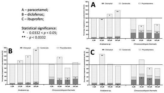 Considering our studies, the phycobiliprotein levels of Anabaena sp. significantly corresponded with the tested pharmaceuticals’ effects on chlorophyll content and growth factors. At 100 µM diclofenac or paracetamol, he photosynthetic pigments of this cyanobacterium were significantly increased (at p < 0.05) compared to the control. Also, the total carotenoid content was higher when exposed to diclofenac. However, in the case of ibuprofen, an increase in carotenoid biosynthesis was only observed at the lowest concentrations. Furthermore, increasing the IBF concentration in the culture medium resulted in a decrease in carotenoids in cells of this blue–green alga. In the case of the species Chroococcidiopsis thermalis, more significant changes in the ratio of photosynthetic pigments in cells were noticeable, indicating a reduced amount of phycobiliproteins. There was a more frequent, statistically significant increase in the concentration of chlorophylls and carotenoids (diclofenac 30–300 µM and ibuprofen 30 µM and 100 µM, respectively). This phenomenon may indicate a different reaction mechanism of the studied species to stress factors. In a few cases, the total amount of pigments in cells exceeded the concentration in the control sample, proving their increased production in the presence of stress factors in the medium. Therefore, it can be concluded that photosynthetic pigments play a role in directly or indirectly counteracting the stress factor. Similar relationships have already been shown in the literature regarding the effects of phosphonates and boronic acids on cyanobacterial cells [41,42].