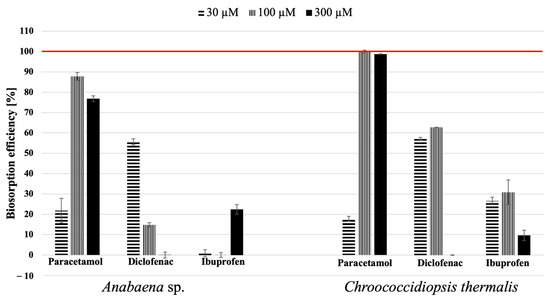 The main objective of this study was to examine the effectiveness of Anabaena sp. and Chroococcidiopsis thermalis cells for removing paracetamol, diclofenac, and ibuprofen from aqueous culture media. The samples extracted from the post-culture media and cell surfaces after 21 days of cultivation were analysed using the LC-MS/MS technique to investigate the biosorption process. Reference samples were prepared using BG11 medium with specified concentrations of the pharmaceuticals. The influence of the initial pharmaceutical concentration on the biosorption process of the tested cyanobacteria is shown in Figure 3. Paracetamol had the highest removal factor among the tested pharmaceuticals, considering both species of cyanobacteria. The decrease in sorption efficiency in the case of paracetamol and diclofenac was associated with an increase in phycobiliprotein contents in the thylakoid membranes of cyanobacterial Anabaena sp. cells. A particular case is represented by the effect of paracetamol at a concentration of 30 µM, where the removal efficiency by both species was about 20%. This efficiency significantly increased at the other two tested concentrations (100 µM and 300 µM), with removal efficiencies reaching 90% for Anabaena sp. and 100% for Chroococcidiopsis thermalis.