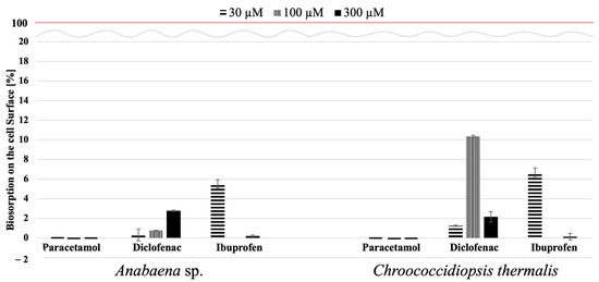 It can be seen that the adsorption of the tested xenopharmaceutical substances, primarily ibuprofen and diclofenac, on the cell surface of the cyanobacteria was relatively low, not exceeding 10% compared to the control sample Furthermore, no paracetamol was detected on the surface of the tested cyanobacteria species’ cells. Therefore, it seems that the adsorption process is not the primary mechanism for removing these pharmaceuticals by cyanobacteria.