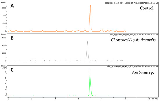 The EIC of m/z ion 587.02 detected in samples of the control sample (BG11 medium with 100 µM diclofenac and day 21 post-culture media of Ch. thermalis and Anabaena sp. subjected to the influence of 100 µM DCF (n = 3, RSD < 10%).