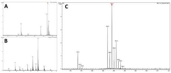 MS and MS/MS spectra of the dissected compound with the m/z ion value 587.01, determined in the post-culture medium of Anabaena sp. containing diclofenac as a studied xenopharmaceutical. (A) The MS spectrum of the dissected compound. (B) The MS/MS spectrum of the dissected compound. (C) An enlargement of (A).