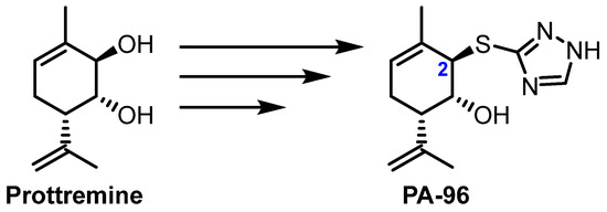 Earlier, our group synthesised (1R,2R,6S)-3-methyl-6-(prop-1-en-2-yl)cyclohex-3-ene-1,2-diol starting from (−)-verbenone. This agent demonstrated effective antiparkinsonian activity at a dose of 20 mg/kg comparable to that of L-DOPA administered at doses of 50–100 mg/kg in various mouse and rat models, such as MPTP-, haloperidol-, and rotenone-induced models [34,35]. The agent, named Prottremine, has low acute toxicity (LD50 of 4250 mg/kg in mice) [36], and based on its properties, we have conducted its preclinical studies. Moreover, to date, Prottremine has successfully passed the first phase of clinical trials [37].