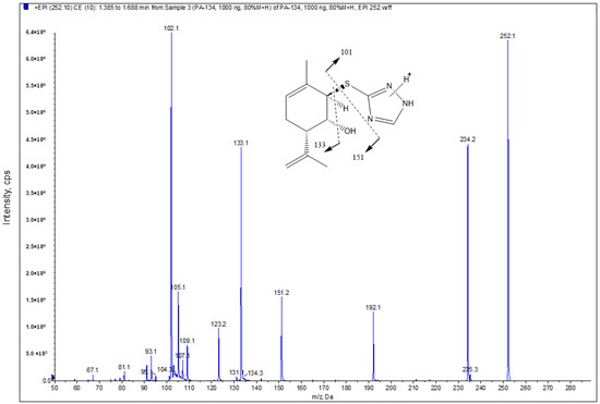 The positive ESI mode was selected for sample analysis. Firstly, a PA-96 solution was infused directly into the mass spectrometer; the mass spectrum was obtained in the +Q1 mode (without fragmentation), and the formation of two molecular ions with m/z = 252.2 and 274.1 was observed, corresponding to the formation of the protonated form [M+H]+ and to the adduct [M+Na]+, respectively (Figure S1). During the fragmentation of the molecular ion with m/z = 252.2 at low, medium, and high energy levels, the formation of fragment ions having m/z = 234.1, 151.2, 133.1, and 102.1 was observed (Figures S2–S4). When the molecular ion with m/z = 274.1 was fragmented, intense product ions with m/z = 256.3, 124.1, and 105.1 were obtained (Figures S5–S7).