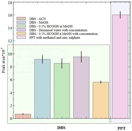 There are many methods for whole blood sample preparation, and the choice mainly depends on the type and volume of the sample, the physicochemical properties of the analytes, and the analytical platform used for the analysis. In our experiment, samples were prepared using dried blood spots (DBS), a common method in preclinical studies of new bioactive agents in small animals. Also, a simple protein precipitation (PPT) method using methanol and zinc sulfate (ZnSO4) was used in our work as an alternative approach for whole blood sample preparation. In order to extract PA-96 from DBS samples, methanol, acetonitrile, methanol with 0.1% (v/v) formic acid, and water with the following concentration, as well as methanol with 0.1% (v/v) formic acid with the following concentration were used. The peak area of PA-96 in the chromatograms of the samples obtained after PPT significantly exceeded the peak area after all considered methods of sample preparation (Figure 3).