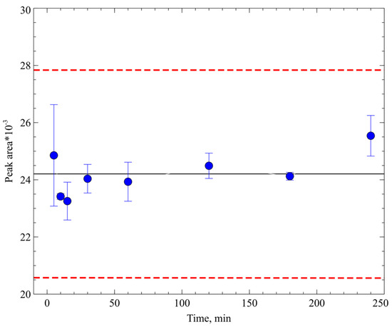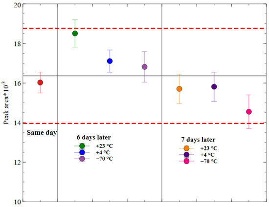 Stability of prepared samples. Black line is the mean value, and red dotted lines indicate mean ± 15%.
