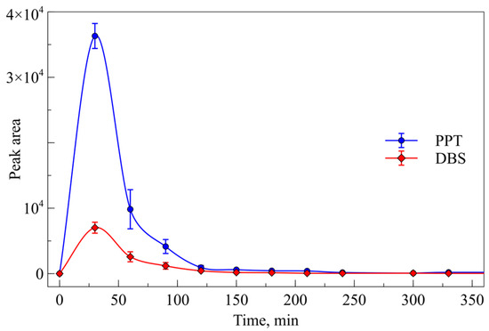 After the development and validation of the method for determination of PA-96 in mice blood, a preliminary pharmacokinetic study was carried out. The agent PA-96 was administered to two mice per os as a suspension in Tween-80 at a dose of 10 mg/kg, and blood samples were taken from the animals at 0.5, 1, 1.5, 2, 2.5, 3, 3.5, 4, 5, 5.5, and 24 h after administration. Four 10 µL samples were taken at each timepoint: two were spotted onto the paper and dried, and two others were precipitated using the ZnSO4 solution. All prepared samples were analysed, and the graph representing the PA-96 peak area values was plotted (Figure 6). As can be observed in Figure 6, the maximum concentration of the compound was observed at the first timepoint (30 min) after administration. Moreover, the PA-96 peak area in the chromatograms of the DBS samples (Figure 6, red line) was significantly lower than that measured for the samples after PPT with methanol and zinc sulphate (Figure 6, blue line). As such, the PPT method for whole blood samples was chosen for the next experiments.