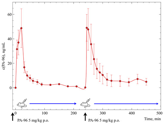In our work, an experiment with double administration of the agent PA-96 was carried out. The substance was administered to mice (n = 6) two times at doses of 5 mg/kg within the interval of 4 h as a formulation in Tween-80. After the first administration, blood was collected from the tail vein of each animal at 5, 10, 20, 30, 40, 50, 60, 75, and 90 min, and 2, 2.5, 3, 3.5, and 4 h. After the administration of the second dose, blood was collected at the same timepoints, and all samples were prepared following the PPT protocol.