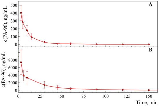 Figure 9A,B show concentration–time profiles for PA-96 after its i.v. injection to mice at the doses of 1 mg/kg and 10 mg/kg, respectively. As can be observed in the graphs, the substance is absorbed rapidly, and its concentration decreases twofold within 10–15 min after injection. Afterwards, the concentration of PA-96 decreases smoothly and reaches the level of several nanograms per mL 1 h after administration.