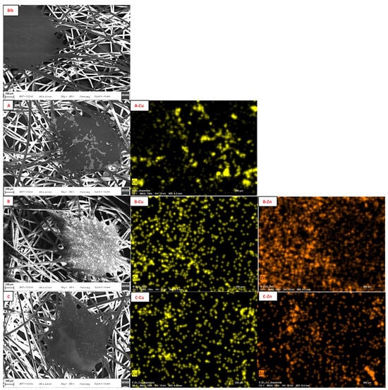 The morphological characteristics of FMs were investigated by SEM (Figure 3). The images showed the fibers with cylindrical shape and smooth surface; at regular distance, there were some more compact islets in which the fibers blended. The analysis confirmed that functionalization occurred in each sample, visible as scales around the fibers or on the islets [73]. Elemental mapping attested the presence of the corresponding metals and showed their distribution on the surface (Figure 3).