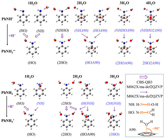 Figure 1 presents a group of optimized models illustrating the (de)protonated states of H-PhNH•/H-PhNH2•+ and H-PhNH2/H-PhNH3+ as a typical example. It is notable that some models undergo significant changes or fail to meet convergence criteria when calculated based on the CBS-QB3 method (labeled in blue in Figure 1). This is primarily due to the readjustments made to the positions of H2O molecules during optimization with the CBS-QB3 method. Consequently, the final molecular models were significantly different from the originally optimized structures based on M062X(D3)/6-311++g(d,p).