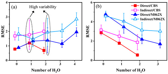 In the case of R-PhNH2•+, the variation in calculation accuracy showed a more complex pattern. With the direct approach, the calculation accuracy initially decreased (i.e., RMSEaver increased) when adding only one H2O molecule. As more H2O molecules were included in the models, the calculation accuracy subsequently improved until the number of H2O molecules exceeded three, in which case the calculation accuracy decreased (RMSEaver increased) once again. Conversely, different results were obtained with the indirect approach. With the exception of adding a single H2O molecule based on the M062X(D3)/ma-def2QZVP method, the inclusion of additional H2O molecules generally decreased calculation accuracy with the indirect approach, as evidenced by an increase in RMSEaver.