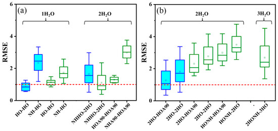 Regarding R-PhNH3+ (Figure 3b), the lowest RMSE was obtained with the CBS-QB3 method with two H2O molecules. H2O and R-PhNH2 were constructed according to the 2HO structure, while H2O and R-PhNH3+ were built based on the HOA90 structure (2HO-HOA90, see Figure 1 for these structures). In the case of the M062X(D3)/ma-def2QZVP method, the best model includes three H2O molecules positioned in the 2HONH structure for R-PhNH2 and in the 3HO structure for R-PhNH3+ (2HONH-3HO). However, the RMSE values obtained from all models based on the M062X(D3)/ma-def2QZVP method exceeded 1.