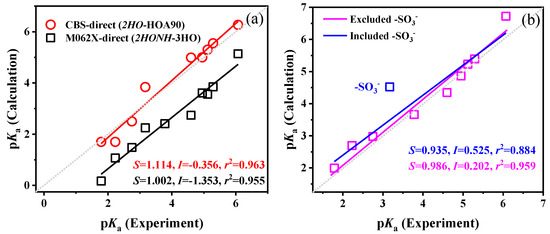 Validation of the performance of different combinations of models and methods on pKa calculations of R-PhNH3+. Calculated pKa values were based on (a) CBS-QB3 with two H2O molecules in models and M062X(D3)/ma-def2QZVP with three H2O molecules in models; (b) revDSD-PBEP86-D3(BJ)/ma-def2QZVPP method with three H2O molecules around amino and extra H2O near R group for formation of hydrogen bonds (correction method: C0). The dotted lines indicate the ideal results with S = 1 and I = 0.
