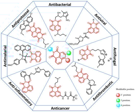 The favorable pharmacological activity and ease of synthesis of naphthylimides and their derivatives are significant advantages for the design and development of novel naphthylimides and their affixes. This paper presents a comprehensive review of recent advancements in antibacterial, antifungal, anticancer, antimalarial, and antiviral studies of naphthimide-containing heteroconjugates (Figure 2). The review will delve into their mechanism of action, key aspects of design, and practical applications. Relevant articles from 2006 to 2024 were identified through a thorough search and screening of the Web of Science and PubMed databases.