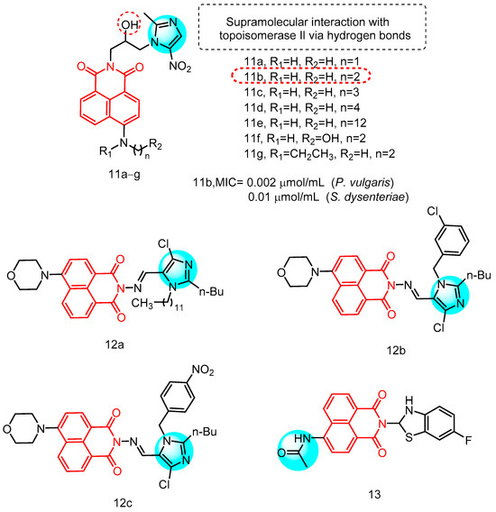 Metronidazole is a widely utilized clinical agent for the treatment of infectious diseases and demonstrates a broad spectrum of biological activities, particularly in terms of antibacterial activity [30]. In 2017, Kang et al. [31] reported a series of novel naphthylimide-derived metronidazoles for the first time (Figure 6). It has been documented that reactive intermediates formed by nitro reduction in microorganisms can covalently bind to DNA and elicit adverse reactions. Stereoprotection of the nitro group is essential to enhance metabolic and physicochemical properties. Therefore, they introduced a substantial structural fragment to facilitate stereoprotection of nitro groups through reduction, thereby generating active intermediates in microorganisms while avoiding triggering adverse reactions and overcoming drug resistance. Nine derivatives 11a–g were evaluated for their antimicrobial activity against a range of Gram-positive bacteria, Gram-negative bacteria, and fungal strains, including methicillin-resistant Staphylococcus aureus (MRSA) see Table 1 below. The majority of the compounds exhibited moderate to good antimicrobial activity in vitro. Notably, ethylamine derivative 11b demonstrated superior broad-spectrum antibacterial efficacy compared to the other compounds. Compound 11b displayed the highest potency among the tested derivatives with a MIC value of 0.002 µmol/mL, surpassing metronidazole, chloramphenicol, and norfloxacin by 95-fold, 50-fold, and 10-fold respectively. Furthermore, E. dysenteriae and E. coli (DH52) showed greater sensitivity to compound 11b (MIC = 0.01 µmol/mL and 0.04 µmol/mL) than to chloramphenicol (MIC = 0.05 µmol/mL and 0.10 µmol/mL). Compound 11b exhibited superior activity compared to chloramphenicol against MRSA, S. aureus and S. typhi. Particularly noteworthy is the 5-fold increase in inhibitory potency against MRSA compared to metronidazole, with a MIC value of 0.04 µmol/mL. These findings suggest that naphthylimine metronidazole 11b holds significant promise for the development of more effective broad-spectrum antimicrobial agents. Furthermore, SAR analysis revealed that the amino group positively influenced biological activity, and the length of the alkyl chain also impacted antimicrobial efficacy, with suitable alkyl chains favoring biological activity of the target compounds. However, introducing hydroxyl groups on the alkyl chain in compound 11f did not enhance inhibitory efficacy relative to compound 11b. Similarly, ethylation of the secondary amino group in compound 11g did not result in increased inhibitory potency; although its MIC value against S. typhi was higher than that of chloramphenicol (MIC = 0.10 µmol/mL). The most active molecule, 11b, not only formed a stable supramolecular complex with calf thymus DNA to inhibit DNA replication and exert antimicrobial activity but also efficiently interacted with HSA through formation of a biosupramolecular complex at a ratio of 1:1. This suggests that naphthylimidomethylnitrozole has great potential for development as a potent broad-spectrum antimicrobial agent.