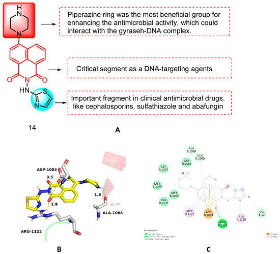 In 2017, Chen et al. [38] reported a series of novel naphthimide-aminothiazole hybrids and evaluated their efficacy against a panel of five Gram-positive bacteria, six Gram-negative bacteria, and five fungi using the 2-fold dilution method. Among these compounds, piperazinyl derivative 14 (Figure 7) exhibited a broad spectrum of antimicrobial activity. Structure–activity relationship (SAR) analysis revealed that the presence of alicyclic amino substituents significantly influenced its inhibitory activity. Furthermore, it was found that the piperazinyl ring could interact with the gyraseh–DNA complex, thereby enhancing its antimicrobial potency. Conversely, the alkyl group on the piperazine ring was found to be detrimental to its antimicrobial activity. Additionally, modification at the 4-position of the aminothiazole ring was also observed to have an adverse effect on its antimicrobial potential. Notably, compound 14 demonstrated effective inhibition against MRSA and Escherichia coli, with minimum inhibitory concentration (MIC) values of 4 µg/mL and 8 µg/mL, respectively. Compound 14 exhibited membrane activity, low toxicity on mammalian cells, and rapid MRSA eradication, without eliciting bacterial resistance. Molecular docking studies showed that the docking pattern of compound 14 with the gyrase–DNA complex (PDB code: 2XCS) was as shown in Figure 7. Molecule 14 can interact with ARG-1122 of the gyrase–DNA complex through the formation of a hydrogen bond between the carbonyl group of the naphthylimide backbone and the DNA base pair. The unbonded p orbitals on the amino group of ASP-1083 are able to interact with the π-electronic system of the naphthylimide ring, which results in a p-π conjugation effect. This effect enhances the mutual attraction between the two and contributes to the stability of the complex, which plays an important role in the binding ability of the ligand and the stability of the docked conformation. In addition, the NH group of the piperazine ring at the 4h position of the naphthylimide fragment is very close to residue ALA-1068, which indicates the necessity of the NH group for enhancing the biological activity. The binding behavior suggests that the interaction between HSA and the 14 molecule is spontaneous, with hydrophobic interactions and hydrogen bonding playing crucial roles in the translocation of derivative 14. Therefore, naphthyliminothiazole 14 may serve as a promising multi-targeted anti-MRSA drug candidate.