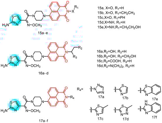 In 2021, Zhang et al. [39] reported a series of novel compounds (Figure 8) characterized by the integration of an aminothiazole oxime moiety and a piperazine bridge at the 4-position of the naphthylimide core, along with substitution at the N-position with various substituents. These compounds were evaluated for their activity against five Gram-positive and six Gram-negative bacteria see Table 1 below, revealing that almost all target compounds containing an aminothiazole oxime moiety exhibited stronger inhibitory activity compared to the non-aminothiazole oxime-containing fragments of the intermediates. The naphthimide-based aminothiazole oximes, particularly those with longer alkyl chains or larger hydrophobic alicyclic rings, exhibited significant advantages in anti-MRSA activity. SAR analysis revealed that the incorporation of a heteroatom linker at the N-position of the naphthimide portion disrupted the affinity equilibrium, leading to loss of bioactivity. Furthermore, the presence of the heteratomic linker efficiently enhanced the antimicrobial activity, especially against MRSA. Notably, derivatives 15a (hydroxy), 15b (ethoxy), 15c (phenoxy), 15d (amino), and 15e (hydroxyethylamine) demonstrated superior or equal anti-MRSA activities compared to norfloxacin. In addition to the enhanced anti-MRSA activity, there was also a noticeable enhancement in the antibacterial activity against other bacteria, possibly attributed to the increased likelihood of heteroatom linkers interacting with biomolecules and promoting the overall antibacterial efficacy. Among compounds 16a–d containing ethyl units linking hydrophilic groups, the dimeglumine group (16d) exhibited the most potent anti-MRSA effect, with an MIC value of 0.5 µg/mL, which was 2-fold higher than tetracycline, 4-fold higher than vancomycin, 8-fold higher than ciprofloxacin, and 32-fold higher than norfloxacin. Furthermore, compound 16d demonstrated broad-spectrum inhibitory activity against reference drugs such as MRSA, S. aureus ATCC 25,923, S. aureus ATCC 29,213, Enterococcus faecalis, Klebsiella pneumoniae, E. coli ATCC 25,922, and P. aeruginosa ATCC 27,853, suggesting that naphthylimide modified by dimethylenediamine segments has significant potential for development. Notably, compound 16d not only exhibits bactericidal potential but also functions as an antimicrobial agent by triggering a PBP2a metabotropic tensile reaction and acting as a mutagen to revitalize old drugs.