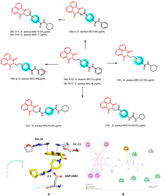 In 2024, Rana et al. [41] reported a series of novel naphthylimide-thiourea derivatives (Figure 10), which were subjected to ESKAP assay and Mycobacterium pathogen assay. The synthesized compounds were evaluated for their bacteriostatic activity see Table 1 below, and it was found that compound 21b showed the most potent bacteriostatic activity against S. aureus (MIC = 0.03125 μg/mL). Compound 19h also showed inhibitory activity against S. aureus (MIC = 0.125 μg/mL). Compound 21b was non-toxic to Vero cells, with an SI value >3200. Additionally, compound 21b demonstrated equivalent activity against MDR S. aureus (including VRSA), with an MIC of 0.06 μg/mL. Moreover, compound 21b exhibited concentration-dependent bacteriostatic properties. Molecular docking studies indicated that compound 21b exerts antibacterial activity by inhibiting the DNA gyrase enzyme. To understand the binding mode and interactions of compound 21b, we performed molecular docking of the active site of S. aureus DNA gyrase complexed with GSK299423 (PDB ID 2XCS) as shown in Figure 10. The resultant compound formed a hydrogen bond at 21b with ASP-1083 at a distance of 2.1 Å via a thiourea-based nitrogen atom. The naphthimide ring of the compound was DNA intercalated with DG10 and DC11 through π-π stacking interactions, as shown in Figure 10, which revealed the stability of compound 21b at the active site and its positive interactions over a simulation period of 100 ns. Furthermore, Rana et al. through ADME studies confirmed that the compounds adhere to Lipinski’s rule of five and are considered druggable. These findings suggest that these compounds hold potential for further development as potent antimicrobial agents.