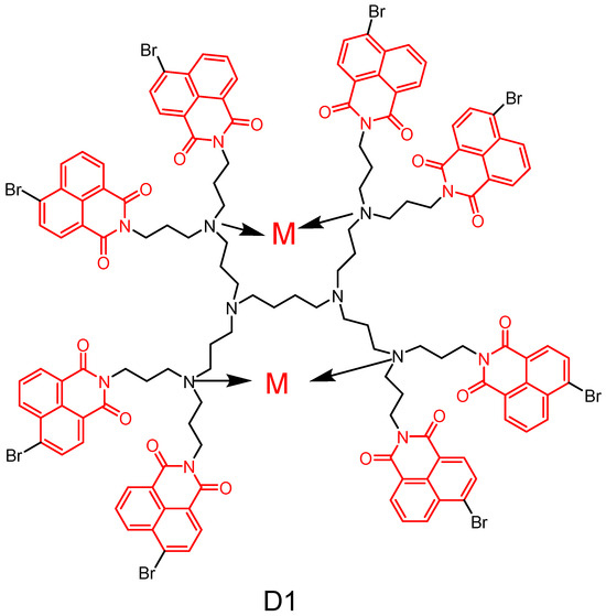 In 2014, Staneva et al. [51] reported the synthesis of a novel second-generation polypropylamine dendritic macromolecule (Figure 13) containing eight 4-bromo-1,8-naphthimide units and their zinc and copper complexes at the periphery of the dendritic macromolecule. The photophysical properties of the metal-ion-free dendritic polymer and its complexes were investigated in organic solvents with varying polarities. In vitro antimicrobial screening demonstrated that the newly synthesized metal dendritic macromolecules exhibited potent bacteriostatic activity against several pathogenic Gram-positive and Gram-negative bacteria, as well as Saccharomyces cerevisiae and pathogenic C. cerevisiae. Furthermore, it was observed that the microbial activity of the complexes remained unaffected by the nature of the metal ions present. These findings suggest that these new metal complexes have potential for developing novel antimicrobial formulations to effectively combat infections caused primarily by Fusobacterium, Micrococcus, and Candida.