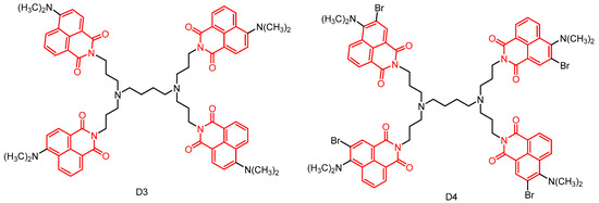 In 2020, Staneva et al. [53] reported two new photoactive dendrimers through peripheral modification of first-generation polypropylene imine dendrimers (Figure 15). The photophysical properties of all compounds were investigated in ethanol and chloroform, revealing their absorption and emission of yellow–green fluorescence in the visible region. Furthermore, their antimicrobial activity in solution and after deposition on cotton fabrics was examined. Notably, their study represents the first investigation into the effect of light on the antibacterial activity of 1,8-naphthimides. The results demonstrated that dendrimer D3 and dendrimer D4 completely inhibited the growth of Gram-positive bacteria after light treatment in solution, whereas only dendrimer D4 had a similar effect on Gram-negative bacteria. Upon application to cotton fabrics, compound D4 exhibited complete inactivation of Gram-positive bacterial growth upon light irradiation, suggesting its potential use as an antimicrobial photodynamic therapeutic agent for producing antimicrobial textiles. Moreover, given the ability of substance D4 to produce at least two effects on viruses, it has been suggested that substances with similar structures may hold promise as inhibitors of herpes infections.