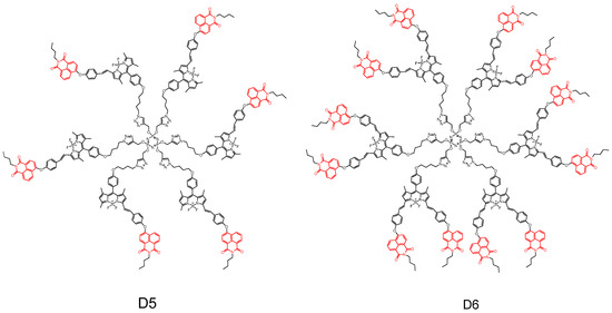 Chemical structures of naphthalimide–BODIPY–cyclotriphosphazene triads D5 and D6.