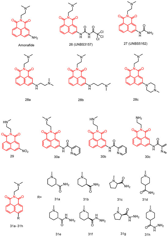In 2008, Xie et al. [66] reported a series of amonafide analogs showing potential anticancer activity against HeLa and P388D1 cell lines see Table 2 below, with 28a, 28b, and 28c (Figure 18) showing superior activity to amonafide in HeLa cells. DNA binding studies showed that they bind DNA through a similar amonafide pattern. More importantly, the new analogs can avoid the side effects of amonafide, due to their structure lacking a primary amine at 5-position.
