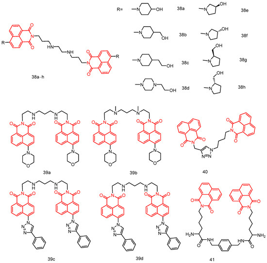 In 2023, Ge et al. [68] reported several newly prepared naphthylimide derivatives and their biological properties. Some of these derivatives demonstrated notable activity see Table 2 below. Among them, compounds 30a, 30b, and 30c (Figure 18) showed the highest activity against A549 cells, with IC50 values around 3 μM. The anticancer activity could be fine-tuned by modifying the 3-position of the naphthylimide ring and side chain. The activity followed the order: -NO2 ≈ pyridine and tertiary nitrogen atoms ≈ secondary nitrogen > primary nitrogen. Compounds 30a and 30b significantly damaged DNA. Furthermore, compounds 30a and 30b induced significant autophagy in A549 cancer cells. Both compounds possessed the ability to inhibit FTO demethylase activity, which could explain their high antiproliferative capacity. These potentially useful naphthylimides could facilitate research on cancer therapeutics, including the mechanisms of the autophagic death pathway and inhibition of FTO demethylation.