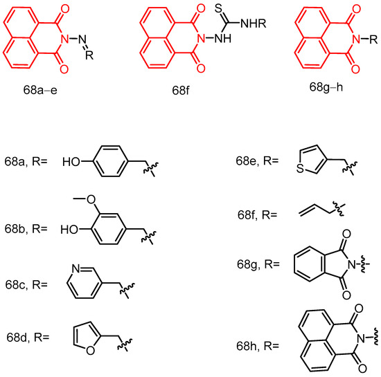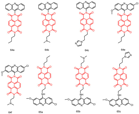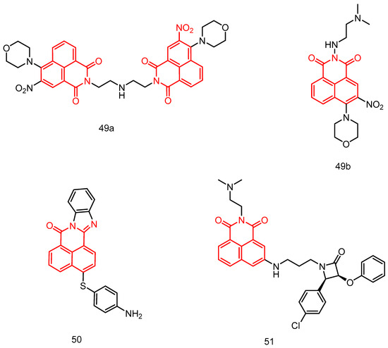 Structures of compounds with heterocyclic naphthylimine backbones already in clinical development trials (The red part is the structure of naphthylimide).