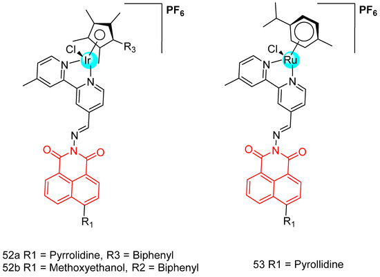 - Ma, W.; Zhang, S.; Tian, Z.; Xu, Z.; Zhang, Y.; Xia, X.; Chen, X.; Liu, Z. Potential anticancer agent for selective damage to mitochondria or lysosomes: Naphthalimide-modified fluorescent biomarker half-sandwich iridium (III) and ruthenium (II) complexes. Eur. J. Med. Chem. 2019, 181, 111599. [Google Scholar] [CrossRef]