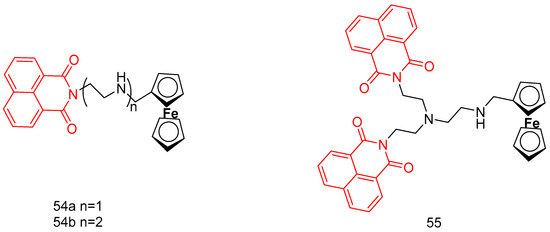 - Jia, D.-G.; Zheng, J.-A.; Fan, Y.-R.; Yu, J.-Q.; Wu, X.-L.; Wang, B.-J.; Yang, X.-B.; Huang, Y. Ferrocene appended naphthalimide derivatives: Synthesis, DNA binding, and in vitro cytotoxic activity. J. Organomet. Chem. 2019, 888, 16–23. [Google Scholar] [CrossRef]