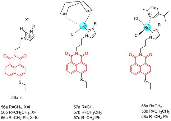 - Streciwilk, W.; Terenzi, A.; Cheng, X.; Hager, L.; Dabiri, Y.; Prochnow, P.; Bandow, J.E.; Wölfl, S.; Keppler, B.K.; Ott, I. Fluorescent organometallic rhodium (I) and ruthenium (II) metallodrugs with 4-ethylthio-1, 8-naphthalimide ligands: Antiproliferative effects, cellular uptake and DNA-interaction. Eur. J. Med. Chem. 2018, 156, 148–161. [Google Scholar] [CrossRef]