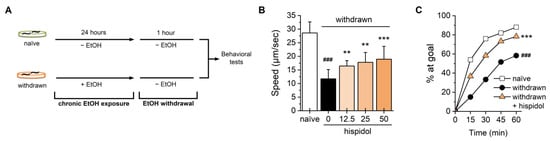 Effects of hispidol on ethanol withdrawal-induced behaviors in C. elegans. (A) Age-synchronized worms were exposed to 150 mM ethanol for 24 h and subsequently transferred to fresh plates for a 1-h withdrawal period; (B) Locomotion speed of withdrawn worms was assessed under a dissecting microscope; (C) The chemotactic ability of withdrawn worms toward the attractant OP50 was monitored every 15 min for 1 h. Statistical significance is indicated as follows: ### p < 0.001 compared with naïve animals; ** p < 0.01 and *** p < 0.001 compared with ethanol-exposed worms.