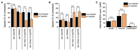 Involvement of BK channel modulation in hispidol-mediated alterations of ethanol-induced behaviors. (A) Age-synchronized slo-1(js379), slo-1(RNAi), slo-1(+/js379), and slo-1(hslo-1+/js379) worms were exposed to 300 mM ethanol for 10 min, and their locomotion speed was measured; (B) Locomotion speed of slo-1(js379), slo-1(RNAi), slo-1(+/js379), and slo-1(hslo-1+/js379) worms was assessed following ethanol withdrawal; (C) Internal ethanol concentration in wild-type worms was spectrophotometrically analyzed at three different time points: after 10 min of ethanol exposure (acute), after 24 h of ethanol exposure (chronic), and after an additional 1-h withdrawal following 24 h of ethanol exposure). Statistical significance is indicated as follows: *** p < 0.001 compared with hispidol-untreated worms; n.s. not significant.