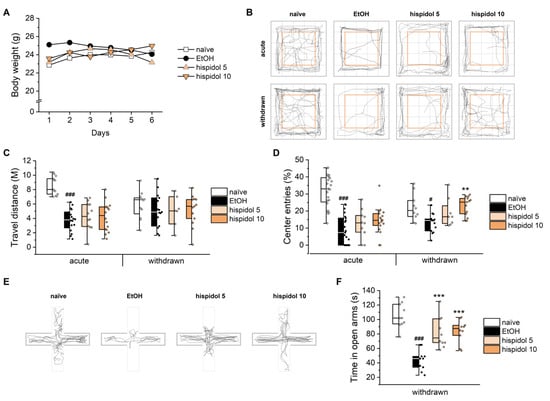 Effects of hispidol on ethanol-induced behaviors in mice. (A) Body weights of C57BL/6 mice monitored over seven days during a series of ethanol intoxications; (B) Motion trajectories recorded during the open field test; (C) Total distance traveled and (D) entries of center zone by mice in the open field test; (E) Motion trajectories recorded during the elevated plus maze test; (F) Time spent in the open arms in the elevated plus maze test. Statistical significance is indicated as follows: # p < 0.05 and ### p < 0.001 compared with naïve animals; ** p < 0.01 and *** p < 0.001 compared with ethanol-exposed worms.