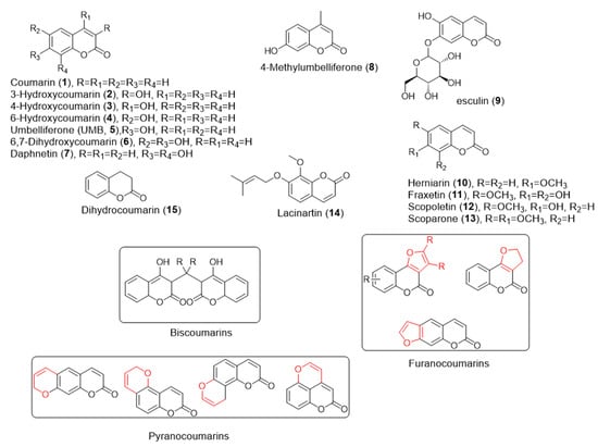 Coumarin is a natural compound that was isolated from Coumarouna odorata in 1820 by Vogel. It belongs to the group of simple phenolic compounds found in plants, microorganisms, and some animals [12]. Some plant families like Umbelliferae, Rutaceae, Compositae, Leguminosae, Oleaceae, Moraceae, and Thymelaeaceae produce high levels of coumarin compounds. 2H-1-benzopyran-2-one is the basic structure of coumarin (1), and coumarins are further classified into simple and complex coumarins based on this structure. Simple coumarins include 3-hydroxy (2), 4-hydroxy (3), 6-hydroxy (4), 7-hydroxy (umbelliferone, 5), 6,7-dihydroxycoumarins (6), daphnetin (7), 4-methylumbelliferone (8), esculin (9), herniarin (10), fraxetin (11), scopoletin (12), scoparone (13), and lacinartin (14). Complex coumarins include biscoumarins, furanocoumarins, pyranocoumarins, and dihydrofurocoumarins [12,13,14,15] (Figure 1).