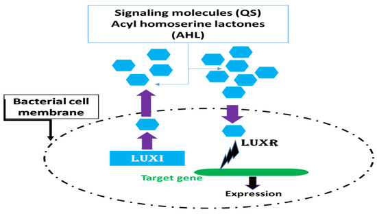 AHLs are the QS signaling molecules found in Gram-negative bacteria, with autoinducer 1 (AI-1) serving as an example. They are water-soluble molecules that can easily permeate through bacterial cellular membranes. Consequently, AHLs freely enter and leave the bacterial cells to maintain constant concentrations inside and outside [34,35]. The LuxR–LuxI system is the typical regulatory system of Gram-negative bacteria. A monomeric LuxI homolog catalyzes the synthesis of an AHL. When the AHL reaches a critical concentration, it can bind to a LuxR homolog and stabilize the active dimeric protein. The AHL-bound LuxR can bind to QS-activated promoters of specific DNA target sites to adjust the expression of the target genes [36] (Figure 2).