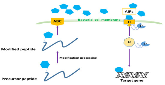 Autoinducer peptides (AIPs) are the signaling molecules of Gram-positive bacteria that are recognized by histidine kinases (receptors) on the membrane or in the cytoplasm. The QS system in Gram-positive bacteria is divided into two parts. The first part is a specific autoinducer peptide transport system, and the second part is a regulatory signal transduction system [37,38]. Through a series of changes and processes, the peptide precursor becomes a stable active signaling molecule (AIP) that is secreted into the extracellular environment with the help of enzyme ABC transferase (ATP-binding cassette transporter). When the extracellular secretion of AIPs reaches the needed concentration, it interacts with the phosphokinase biocomponent on the cell membrane. This interaction between phosphokinase and AIP leads to the autophosphorylation of retained histidine residues (H) followed by the phosphorylation of the aspartic acid residues (D) in the regulatory protein that responds to it. Lastly, the phosphorylated response regulatory protein interacts with specific DNA target sites to adjust the expression of the target genes [39] (Figure 3).