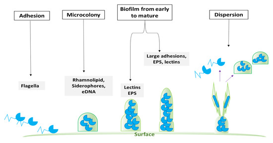 The colony behavior of bacterial cells is controlled by both QS and biofilm formation. The signal transmission of autoinducers between cells leading to the detection of bacterial cell density is known as QS, while biofilm is known as bacterial cell aggregation. The cell aggregates are quite similar and connected to each other through bacterial cell self-excretion of an extracellular matrix known as biofilm; thus, biofilm is known as an environment controlled by QS [43]. Streptococcus oralis 34 secretes autoinducer (AI-2), which is necessary for biofilm formation by S. oralis 34 and Actinomyces naeslundii [44]. AI-2 was also found to be a mediator for QS in E. coli; thus, it is involved in biofilm formation, regulation of motility genes, synthesis of flagellum, and chemotaxis [45]. Biofilm formation in bacteria is an active and layered process. The first and crucial stage of the formation of bacterial biofilm is adhesion to the host, which is followed by the biofilm aggregation stage, maturation, and dispersion (Figure 4). Bacterial cells adhere mainly by binding to the host surface through the outer membrane adhesive proteins and by excreting exopolysaccharides (EPSs) [46]. Furthermore, QS is involved in the dynamic process of biofilm formation in both Gram-negative and Gram-positive bacteria [47]. QS in P. aeruginosa (as a representative Gram-negative bacteria) is complicated and is judged by transcriptional regulators MvaT and RsaL. It is also controlled by post transcriptional regulators (RsmA), sigma factors (RpoN and RpoS), and 2-heptyl-3-hydroxy-4(1H)-quinolone (PQS) systems [43]. In addition to the functions that are controlled by LasI/LasR/RhII/RhIR, there are several virulence factors responsible for biofilm formation, such as rhamnolipid, lectin, and siderophores [48]. Surface movement (clustering) is maintained by rhamnolipid, leading to biofilm formation. Additionally, LecA and LecB are considered QS-dependent carbohydrates (bending lectins) that exhibit an essential role in biofilm formation in mutants that cannot produce biofilm [49,50]. The PQS activates the production of extracellular DNA (eDNA) that interacts with exopolysaccharides (positively charged molecules) in the matrix to form the biofilm [51].
