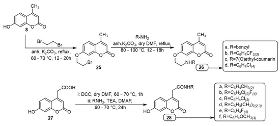 A series of C-7(O) modified 4-methyl coumarinylamines (26a–26d) and 7-hydroxycoumarinyl acetamides (28a–28f) have been synthesized according to Scheme 2 and were screened for their antibiofilm activity against S. aureus and P. aeruginosa [78]. Compounds 26a–26d were obtained via the reaction of compound 8 with 1,2-dibromoethane under reflux in the presence of anhydrous K2CO3 to yield compound 25 as an intermediate. The reaction of the intermediate 25 with different primary aromatic amines in dry N,N-dimethylformamide and in the presence of anhydrous K2CO3 under reflux afforded C-7(O) modified 4-methyl coumarinylamines (26a–26d) (Scheme 2). Compounds 28a–28f were prepared via heating of 2-(7-hydroxy-2-oxo-2H-chromen-4-yl)acetic acid (27) with dicyclohexyl carbodiimide (DCC) in dry DMF. Then, different aromatic amins were added in the presence of a catalytic amount of triethylamine and 4-dimethylaminopyridine (DMAP) to afford the corresponding 7-hydroxycoumarinyl acetamides (28a–28f) (Scheme 2). Most of the tested compounds 26a–d and 28a–f showed maximum inhibition of 50% against both S. aureus and P. aeruginosa [78]. Total protein quantification of surface-adhered biofilm revealed a significant decrease in the biofilm-forming ability of both S. aureus and P. aeruginosa by 26a (66.96% and 84.19%) and 26b (54.73% and 55.06%), respectively. However, compounds 26a (66.86%), 26b (66.77%), 28c (71.91%), and 26c (71.95%) showed a significant antibiofilm effect against S. aureus only. On the other hand, compounds 28d (60.96%), 28e (61.56%), 28f (73.35%), and 26d (53.97%) showed a maximum antibiofilm effect against P. aeruginosa only as revealed by total protein quantification of biofilm [78].