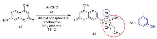 Yang et al. prepared a series of coumarin aminophosphonates as coumaphos analogs (insecticide reveals great medical potential in agriculture) via the reaction of 4-methyl-7-aminocoumarin (40) with various aldehydes (41) in the presence of diethyl phosphonate (Scheme 6). The bioactivity assessment identified that 3-hydroxylphenyl aminophosphonate (42) exhibited profound in vitro inhibition potency against S. aureus at low concentrations (0.5 μg/mL). Also, 42 was capable of eradicating the S. aureus biofilm, thus alleviating the development of S. aureus resistance. Thus, it was able to destroy the integrity of the cell membrane, which resulted in protein leakage and metabolism inhibition. Biofilm formation decreased significantly by 30% at a concentration of compound 42 that was 16 times its MIC [82].